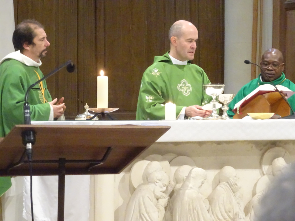Puis le Père Pierre-Etienne a renouvelé les promesses de son ordination de prêtre. La communauté paroissiale lui a confié trois objets symboliques : un livre de catéchèse, une huile pour les malades et un pain (signe du partage).